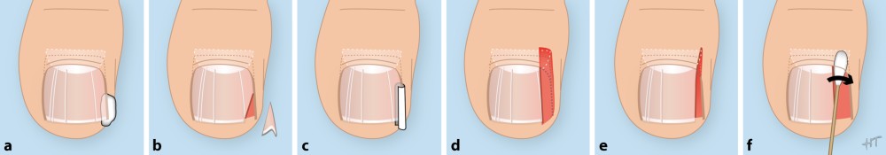 War früher die scharfe chirurgische Entfernung des Nagels mit der zugehörigen Nagelwurzel/-matrix (Emmert-Plastik) Standard, wird heute eine Kombination aus chirurgischer Entfernung des Nagelanteils mit zugehörigem Nagelbettes und chemischer Entfernung (Phenol-Verödung) der Nagelwurzel/-matrix bevorzugt.
